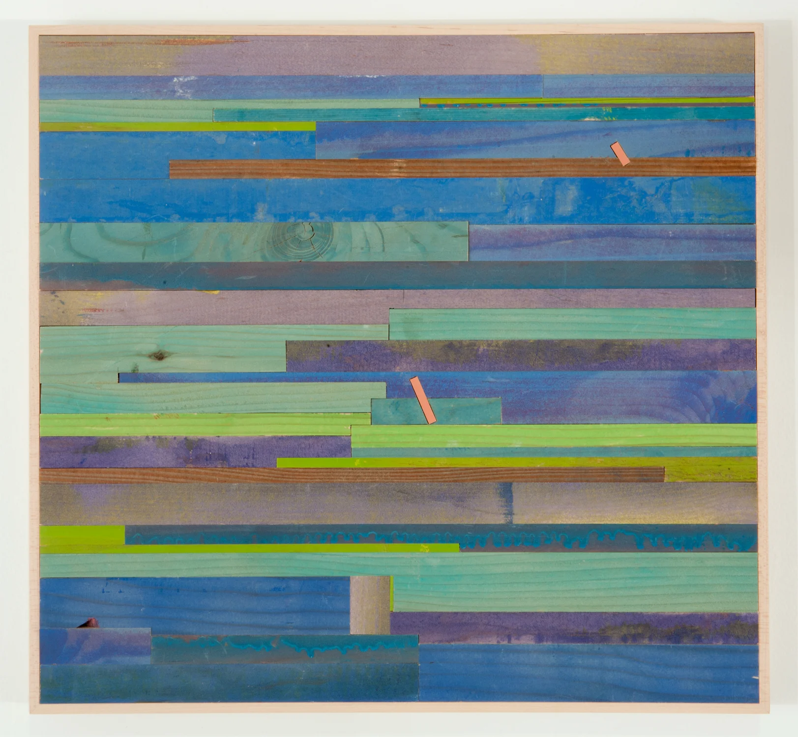 50 pieces of re-cut colored wood strips are used to create the blue hue foundation.